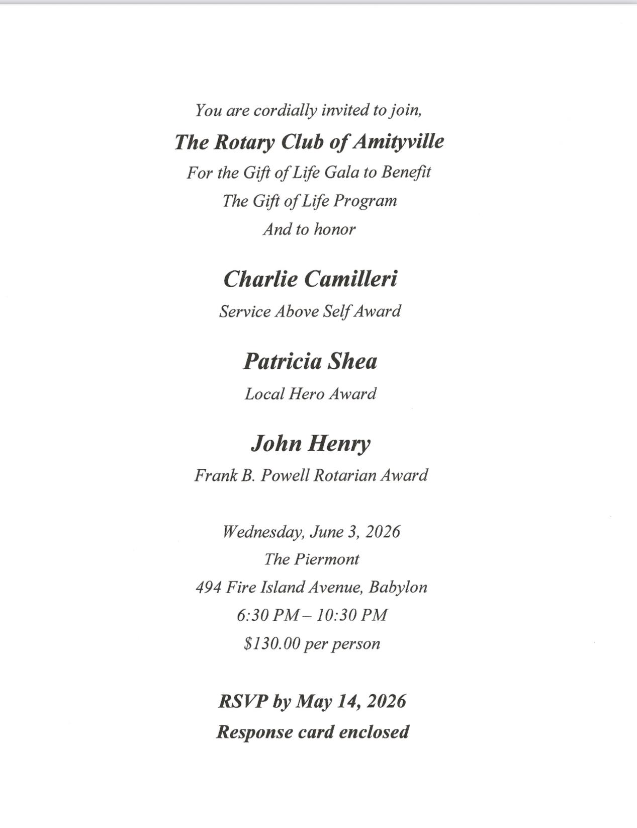 Amityville Club's Gift of Life Gala will be held on June 3, 2026 6:30 p.m. - 10:30 p.m. This lovely event, held at The Piermont in Babylon, will include a cocktail hour, open bar, as well as a delicious dinner.You will have an opportunity to meet our honorees and learn all about the positive impact they have in the community.. There will be raffles and a 50-50 drawing as well. Please consider joining us and/or showing your support through a journal ad. For tickets, journal ads or more information, please contact Barbara at gold5e@aol.com |